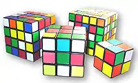 | Variations of Rubik's Cubes (left to right: Rubik's Revenge, Rubik's Cube, Professor's Cube, and Pocket Cube) |