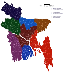 Bangladesh postcode map of the first two digits. Divisions are separated by colour.