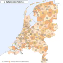 The first two digits indicate a city and a region, the second two digits and the two letters indicate a range of house numbers, usually on the same street. Consequently, a postal address is uniquely defined by the postal code and the house number. On average, a Dutch postal code comprises eight single addresses. There are over 575,000 postal codes in the Netherlands as of 2017.[1]