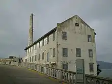 The Power House is an electrical supply building on the northwest coast of Alcatraz Island, off the coast of San Francisco, USA. It was constructed in 1939 for $186,000 as part of a $1.1 million modernization scheme which also included the water tower, New Industries Building, officers quarters and remodeling of the D-block.[1] The white powerhouse smokestack and lighthouse were said to give an "appearance of a ship's mast on either side of the island".[2] "A Warning. Keep Off. Only Government permitted within 200 yards" sign lay in front of the powerhouse to deter people landing on the island at the point.
