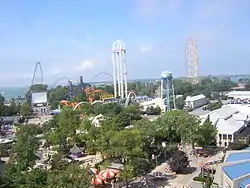 ![]() Overview of Cedar Point with Power Tower in the center, Millennium Force on the left and Top Thrill Dragster on the right. | |