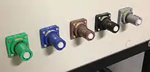 Powerlock connectors are available in colours to match wiring colour standards used in Europe, Australia and North America.[11] The mechanical keying is however independent of the colours, for example a blue connector intended for a neutral connection in Europe will not connect with a blue connector intended for live (phase) connection in North America.