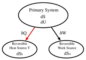 Thermodynamic systems in the maximum work theorem. dU is the energy lost to the reversible heat system as heat energy δQ and to the reversible work system as work δW.