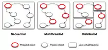 In this model, the application is structured in subsystems. There is one active object (and therefore one thread) for each subsystem, and one subsystem for each active object (or thread). Each subsystem is thus composed of one active object and any number of passive objects—possibly no passive objects. The thread of one subsystem only executes methods in the objects of this subsystem. There are no "shared passive objects" between subsystems.