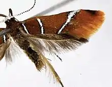 The wingspan is about 15.5 mm. The forewings are ochreous brown with white markings edged with black scales. The hindwings and cilia are dark grey.[1]