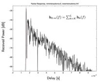 Animation of power delay profiles calculated from partial transfer functions of a propagation graph model. The red line indicates the delay of the direct path.