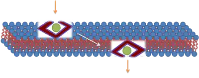 The third mechanism responsible for the translocation is based on the formation of the inverted micelles. Inverted micelles are aggregates of colloidal surfactants in which the polar groups are concentrated in the interior and the lipophilic groups extend outward into the solvent. According to this model, a penetratin dimer combines with the negatively charged phospholipids, thus generating the formation of an inverted micelle inside of the lipid bilayer. The structure of the inverted micelles permits the peptide to remain in a hydrophilic environment.[23][24] [25] Nonetheless, this mechanism is still a matter of discussion, because the distribution of the penetratin between the inner and outer membrane is non-symmetric. This non-symmetric distribution produces an electrical field that has been well established. Increasing the amount of peptide on the outer leaflets causes the electric field to reach a critical value that can generate an electroporation-like event.
