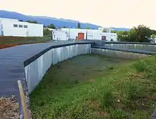 The PSB is part of CERN's accelerator complex. By the time it was constructed, the Meyrin campus had just been enlarged, now covering French territory as well. The center of PSB's rings sits directly on the border between France and Switzerland. Due to the countries’ different regulations regarding buildings at the border, it was decided to build the main PSB construction underground. The only visible PSB infrastructure is located on the Swiss side. The PSB consists of four vertically stacked rings with a radius of 25 meters. Each ring is sectioned into 16 periods with two dipole magnets per period and a triplet focusing structure made up of three quadrupole magnets (focusing, defocusing, focusing).[10] Every magnet structure consists of four single magnets for the four rings stacked on top of each other, sharing one yoke.