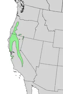 The species is native to Northern California and from central to western and southern Oregon.[8][2] It grows in forests, most often at low elevations near the coast, but is also found in the Sierra Nevada and Cascades. It grows at altitudes of 100–1,900 m (330–6,230 ft).[3][6]
