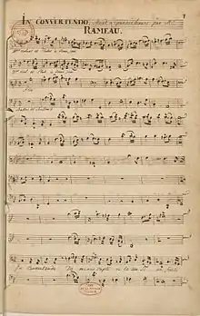 The complete psalm was set in Latin as a motet for a cappella choir by composers including George de La Hèle,[22] Lorenzo Perosi, Jean-Noël Marchand,[23] Dmitri Bortnyansky (1777). Marc-Antoine Charpentier compose in 1670 one "In convertendo Dominus", H.169, for soloists, double chorus, strings and continuo. Also, Sébastien de Brossard, Michel-Richard de Lalande, Patrick Douglas.[24][25] Jean-Philippe Rameau composed In convertendo Dominus c. 1710, for choir and orchestra. Jules Van Nuffel wrote a setting for mixed choir and organ as his Op. 32 in 1926. Giovanni Bernardino Nanino set alternate verses for a cappella choir.[26]