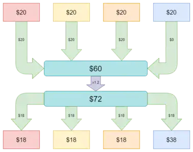 The group's total payoff is maximized when everyone contributes all of their tokens to the public pool. However, the Nash equilibrium in this game is simply zero contributions by all; if the experiment were a purely analytical exercise in game theory it would resolve to zero contributions because any rational agent does best contributing zero, regardless of whatever anyone else does. This only holds if the multiplication factor is less than the number of players, otherwise, the Nash equilibrium is for all players to contribute all of their tokens to the public pool.[1]