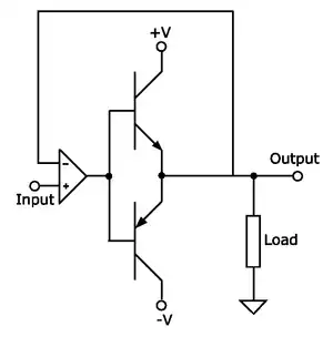 A push–pull amplifier is a type of electronic circuit that uses a pair of active devices that alternately supply current to, or absorb current from, a connected load. This kind of amplifier can enhance both the load capacity and switching speed.