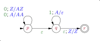 In words, the first two instructions say that in state p any time the symbol 0 is read, one A is pushed onto the stack. Pushing symbol A on top of another A is formalized as replacing top A by AA (and similarly for pushing symbol A on top of a Z).