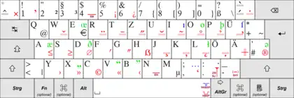 It employs dead keys to type accented characters like “é”, and the AltGr key to access characters in the third level (e.g. “[”, “]”, “@”, the euro sign “€”, or the micro- “µ”). The “T2” layout as specified in the 2012 edition of the German standard also uses the group selection to access special characters like the long s, or foreign characters like “Æ” or “Ə”.