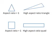 It is the ratio of longest to the shortest side in a cell. Ideally it should be equal to 1 to ensure best results. For multidimensional flow, it should be near to one. Also local variations in cell size should be minimal, i.e. adjacent cell sizes should not vary by more than 20%. Having a large aspect ratio can result in an interpolation error of unacceptable magnitude.