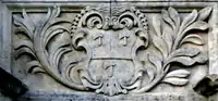 The inscription was transcribed by the Devon topographer Rev. John Swete (d. 1821) in his "Journals".[16] On the sides of the base of the statue are identical heraldic escutcheons showing the arms of Robert Rolle impaling the arms of Duke, Per fesse argent and azure, three chaplets counterchanged, for his wife Elizabeth Duke (d. 1716), daughter of Richard Duke (1652–1733),[17] MP, of Otterton, Devon.