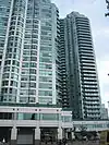 Queens Quay continues to go through a significant transformation. Originally, it served as an access road for the various ports and slips in the inner harbour. The street between Yonge Street and Parliament Street was home to storage buildings devoted to trade on the Saint Lawrence Seaway, major industries such as the Redpath Sugar Refinery and Victory Mills, as well as small commercial enterprises.[2] However, the mainly industrial uses along Queens Quay were slowly replaced by commercial and residential uses, mainly high-rise condominiums. Between 1975 and 1979, a cluster of large, concrete towers were erected at the foot of Bay Street, south of Queens Quay; these included the Westin Harbour Castle and Harbour Square. In 1990, the 40-storey York Quay towers were built and remain the tallest buildings on Queens Quay.[3] The scale and density of these and subsequent high-rise development along Queens Quay were criticized for blocking the lake and failing to provide a welcoming realm for visitors. In 1997 City School (Toronto) relocated to 635 Queens Quay West.[4] In 1999, the Toronto Transit Commission opened a dedicated streetcar right-of-way in the median from Bay Street to Bathurst Street.