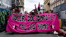 "Be gay, do crime" is a slogan popular in contemporary Pride parades, LGBT-related protests, and graffiti. In 2018, it was popularised on Twitter by a meme created by Io Ascarium of the ABO Comix collective, which sells comics made by other abled LGBTQ+ prisoners.[33] Ascarium describes the phrase as coming "from the communal grab-bag of anti-assimilationist queer slogans. Like 'ACAB' or 'Stonewall was a Riot' it was pulled from the chaotic ether, originated nowhere and belongs to nobody," though Google Trends suggests interest has existed since at least 2011.[34][35] The "memeification" of the "be gay do crime" slogan is an example of increased accessibility into anarchist schools of thought.[30]