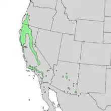 Q. chrysolepis is found in a variety of forest communities in the southwestern United States. It is common in the mountainous regions of California (Sierra Nevada, Coast Ranges, Klamath Mountains, Cascades, San Gabriel Mountains, etc.) with additional populations in the Siskiyou Mountains of southwestern Oregon, western Nevada, northern Baja California, Arizona, southwestern New Mexico, and Chihuahua.[8][9][10] Southwestern New Mexico population are most likely the result of introgression from Quercus palmeri to Q. chrysolepis.[11] Those populations tend to be intermediate in overall morphology, but all lack the diagnostic trichomes and biochemical markers of Q. palmeri; they are best classified as Q. chrysolepis affinity Q. palmer.[12]