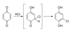Quinones undergo addition reaction to form 1,4-addition products.[10] An example of 1,4-addition reaction is the addition of hydrogen chloride to form chlorohydroquinone: