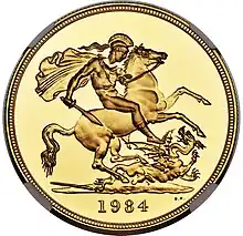 No further £5 gold pieces were struck until 1980, nine years after decimalisation.[40] The Royal Mint realised there was a market for sovereign coins, and began to sell them to collectors at well over face or bullion value.[41] Beginning in 1980, five-pound gold coins were sold every year, except 1983, sometimes in a four-piece proof set with the half sovereign, sovereign and double sovereign, and sometimes sold individually. The pieces sold individually were in uncirculated, rather than proof, condition, and display an encircled U to the left of the date. Pieces up to 1984 used an obverse portrait of Elizabeth by Arnold Machin, and later ones up to 1997 by Raphael Maklouf, excepting the 1989 issue, which featured special designs by Bernard Sindall in honour of the 500th anniversary of the sovereign coin.[40][42][43]
