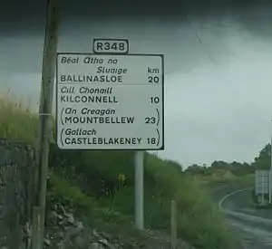 The R348 road is a regional road in Ireland stretching east–west for 51 km (32 mi) along a route north of the R446. It leaves the R446 east of Oranmore and rejoins it in Ballinasloe. The full length of the road lies within County Galway.
