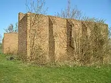 With the facility released from military control, the airfield stood intact yet disused for many years.[4] Eventually the hangars were removed, but the outline of the runways can still be seen in aerial photography. Test probing (2018) suggests the runways remain approximately 5 cm below the now grassed-over surface. Most of the perimeter track remains, mostly in a half-width condition, as do several of the derelict buildings, including the control tower.[18] A few of the Blister hangars remain and are used for farm storage. Most of the pillboxes also remain but, being largely subterranean, are filled in. The ammunition dumps, also derelict, remain.