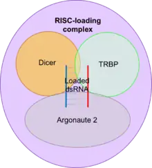 Dicer associates with TRBP and Argonaute 2 to facilitate the transfer of the dsRNA fragments generated by Dicer to Argonaute 2.[44][45]