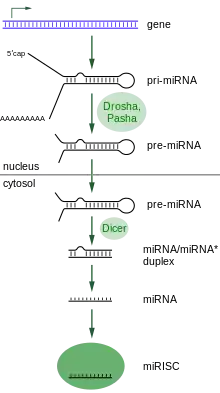 The majority of miRNAs act in the cytoplasm and mediate mRNA degradation or translational arrest.[32] However, some plant miRNAs have been shown to act directly to promote DNA methylation.[33] miRNAs come from hairpin precursors generated by the RNaseIII enzymes Drosha and Dicer.[34] Both miRNA and siRNA form either the RNA-induced silencing complex (RISC) or the nuclear form of RISC known as RNA-induced transcriptional silencing complex (RITS).[35] The volume of literature on miRNA within the framework of RNAi is extensive.