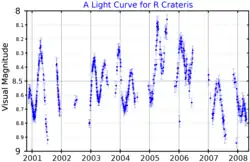 R Crateris is a star about 700 light years from the Earth in the constellation Crater. It is a semiregular variable star, ranging in brightness from magnitude 8.1 to 9.5 over a period of about 160 days.[3] It is not visible to the naked-eye, but can be seen with a small telescope, or binoculars.[11] R Crateris is a double star; the variable star and its magnitude 9.9 F8V companion are separated by 65.4 arcseconds.[12]