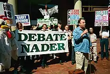 Nader's supporters, with Christopher Hitchens speaking, protest his exclusion from the televised debates in 2000