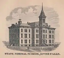 The University of Wisconsin–River Falls was founded in 1874 as River Falls State Normal School, one of the state normal schools created to prepare students for teaching careers and to provide better education to the state's frontier regions.[6] In 1927, the school was renamed River Falls State Teachers College, as the state normal schools became "State Teachers Colleges" that incorporated a significant increase in general education offerings and four-year courses of study leading to a Bachelor of Education degree.[7]