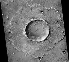 Rampart craters are a specific type of impact crater which are accompanied by distinctive fluidized ejecta features found mainly on Mars. Only one example is known on Earth, the Nördlinger Ries impact structure in Germany.[1] A rampart crater displays an ejecta with a low ridge along its edge. Usually, rampart craters show a lobate outer margin, as if material moved along the surface, rather than flying up and down in a ballistic trajectory. The flows sometimes are diverted around small obstacles, instead of falling on them. The ejecta look as if they move as a mudflow. Some of the shapes of rampart craters can be duplicated by shooting projectiles into mud. Although rampart craters can be found all over Mars, the smaller ones are only found in the high latitudes where ice is predicted to be close to the surface. It seems that the impact has to be powerful enough to penetrate to the level of the subsurface ice. Since ice is thought to be close to the surface in latitudes far from the equator, it does not take a large impact to reach the ice level.[2] Based on images from the Viking program in the 1970s, it is generally accepted that rampart craters are evidence of ice or liquid water beneath the surface of Mars. The impact melts or boils the water in the subsurface producing a distinctive pattern of material surrounding the crater.