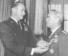 Receiving the Distinguished Service Medal from Air Force Chief of Staff John P. McConnell (left), for services while Commander in Chief, Alaskan Air Command.