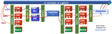 The system is composed of stages: 10, 20, 30, 40, etc. Each stage consists of identical machines, such as CNC milling machines, or RMT machines. The system produces one product, for example, an automotive engine block or a cylinder head. The manufactured product moves on the horizontal conveyor. Then Gantry-10 grips the product and brings it to one of CNC-10. When CNC-10 finishes the processing, Gantry-10 moves it back to the conveyor. The conveyor moves the product to Gantry-20, which grips the product and load it on the RMT-20, and so on. Inspection machines are placed at several stages, and at the end of the manufacturing system.