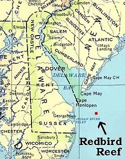 Redbird Reef is an artificial reef located in the Atlantic Ocean, off the coast of Slaughter Beach, Delaware,[1] 16 miles (25.7 km) east of the Indian River Inlet.
