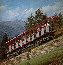 Each section of the line is worked by coaches with 64 seats that are hauled by 40-millimetre-thick cables from their upper stations. The diameter of the electrically driven cable drums is 3.85 metres. The gradient of the line varies between 25 and 82%.