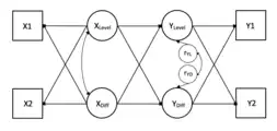 The common fate model is a method of estimating not how two people influence one another, but how two people are similarly influenced by an external force.[79][80] Dyadic means are computed for both the independent and dependent variable to estimate the effects of the dyad as a single unit.[79][80] The between-dyad correlations are adjusted by the within-dyad correlations in order to remove individual-level variation.[79][80] The two partners' predictor and outcome variables are observed variables that are used to compute latent variables (i.e., the 'common fate variables').[79][80] See Figure 4.