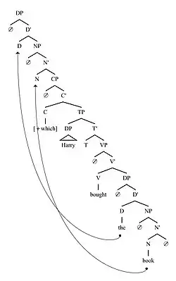The promotional analysis is a transformational analysis from 1973 depicting relative clauses in English, and how relative pronouns are introduced into the embedded clause. This analysis assumes that there is no overt head noun in the deep structure of the main clause. In order to form a relative construction, the noun phrase from the embedded clause is promoted to the empty head of the noun phrase of the main clause. From there, a corresponding relative pronoun leaves a trace in the space of the vacated noun phrase in the embedded clause.[5] For example: