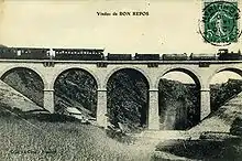 At Morlaix the line was shared with the CF de l'Ouest's standard gauge dual gauge line between Paris and Brest. A dual gauge section of track was laid on the up line on the viaduct across the harbour.[5] This was built by the CF de l'Ouest as part of their Paris - Brest line. The viaduct crossed the Chemins de fer armoricains (CFA) Morlaix - Plestin-les-Grèves line.[3] A platform at Morlaix was shared with the standard gauge.[5] A branch was opened on 12 February 1906 to serve the port at Morlaix. Freight traffic beyond Plougonver ceased from 25 September 1962.[3] The line between Carhaix and Morlaix closed completely on 9 April 1967.[6]