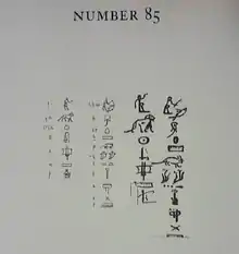 Number 85A small group of cursive hieroglyphic signs is written, which Chace suggests may represent the scribe "trying his pen." It appears to be a phrase or sentence of some kind, and two translations are suggested: 1) "Kill vermin, mice, fresh weeds, numerous spiders. Pray the god Re for warmth, wind and high water." 2) "Interpret this strange matter, which the scribe wrote ... according to what he knew."