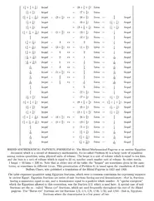 Much of the Rhind Papyrus's material is concerned with Ancient Egyptian units of measurement and especially the dimensional analysis used to convert between them. A concordance of units of measurement used in the papyrus is given in the image.