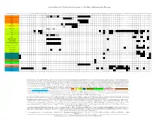 This table summarizes the content of the Rhind Papyrus by means of a concise modern paraphrase. It is based upon the two-volume exposition of the papyrus which was published by Arnold Buffum Chace in 1927, and in 1929.[7] In general, the papyrus consists of four sections: a title page, the 2/n table, a tiny "1–9/10 table", and 91 problems, or "numbers". The latter are numbered from 1 through 87 and include four mathematical items which have been designated by moderns as problems 7B, 59B, 61B, and 82B. Numbers 85–87, meanwhile, are not mathematical items forming part of the body of the document, but instead are respectively: a small phrase ending the document, a piece of "scrap-paper" used to hold the document together (having already contained unrelated writing), and a historical note which is thought to describe a time period shortly after the completion of the body of the papyrus. These three latter items are written on disparate areas of the papyrus's verso (back side), far away from the mathematical content. Chace therefore differentiates them by styling them as numbers as opposed to problems, like the other 88 numbered items.