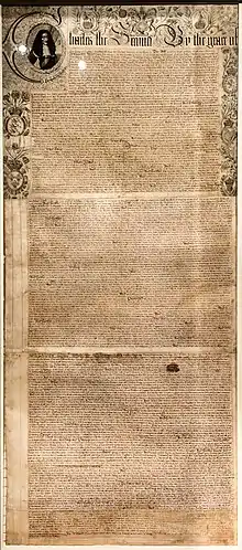 Rhode Island's General Court of Commissioners convened at Newport on 24 November 1663 for the last time under the parliamentary patent of 1643–1644.[13] The inhabitants and legislators gathered to learn the result of John Clarke's decade-long efforts,[13] described in the colonial records: