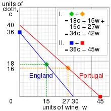 Terms of trade is the rate at which one good could be traded for another. If both countries specialize in the good for which they have a comparative advantage then trade, the terms of trade for a good (that benefit both entities) will fall between each entities opportunity costs. In the example above one unit of cloth would trade for between units of wine and units of wine.[17]