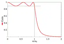 Ripple in the context of the frequency domain refers to the periodic variation in insertion loss with frequency of a filter or some other two-port network. Not all filters exhibit ripple, some have monotonically increasing insertion loss with frequency such as the Butterworth filter. Common classes of filter which exhibit ripple are the Chebyshev filter, inverse Chebyshev filter and the Elliptical filter.[9] The ripple is not usually strictly linearly periodic as can be seen from the example plot. Other examples of networks exhibiting ripple are impedance matching networks that have been designed using Chebyshev polynomials. The ripple of these networks, unlike regular filters, will never reach 0 dB at minimum loss if designed for optimum transmission across the passband as a whole.[10]