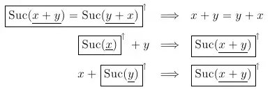 Note that all these annotated rules preserve the skeleton (x + y = y + x, in the first case and x + y in the second/third). Now, annotating the inductive step case, gives us:
