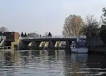 Close to its start, Ember Mill stood on an island in the Ember reached from a footbridge at the end of Orchard Lane by Imber Court, Thames Ditton. The mill was demolished around 1837 and the sluices and waterfalls on either side are all that remain to indicate the site.[2] The mill was originally a corn mill but was later used for manufacturing brass and iron wire.[3] This part of the Ember is bypassed by the new channel of the flood prevention scheme, but a small flow runs into the old course to keep it looking largely as it used to.[4]