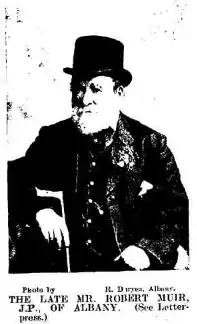 - 1 2 "Death of Mr Robert Muir". Albany Advertiser. Albany, Western Australia: National Library of Australia. 20 August 1904. p. 3. Retrieved 29 December 2015.
