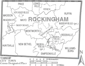 Rockingham County's first court session was convened near Eagle Falls south of the Dan River in February 1786.[10] The following year a wooden courthouse was erected near the center of the county and the community of Rockingham Courthouse was established. The community was renamed Wentworth in 1798,[13] and county court sessions was held there beginning the following May.[14] A new brick courthouse was built in 1824.[13] Wentworth remained a poor and sparse community well into the early 1800s, sustained only by business related to governmental affairs. Leaksville was established in 1795 in an attempt to build a trading community near the confluence of the Dan and Smith rivers.[15]